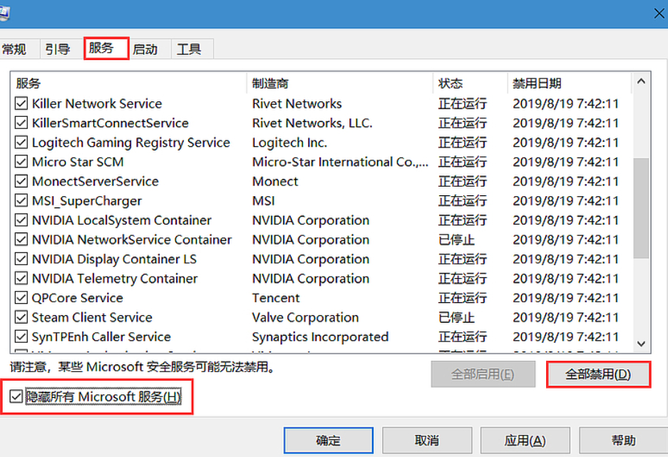 2、其次选择常规,单击“有选择的启动”,然后单击清除“加载启动项”上面的勾,再点击“服务”,单击“隐藏所有Microsoft”服务,然后单击全部禁用。